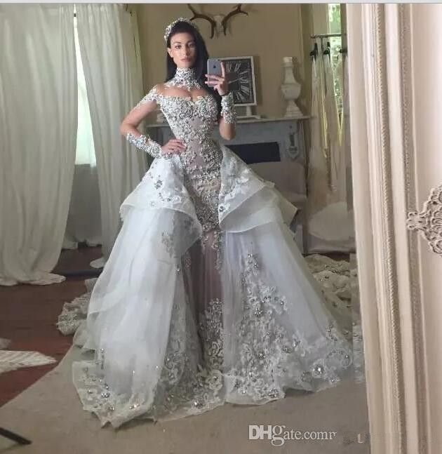 Mermaid High Neck Sheer Wedding Dresses Bling Long Sleeve Detachable Skirt Train 2019 Corset Bridal Wedding Gowns Usa Maternity Wedding Dress Plus