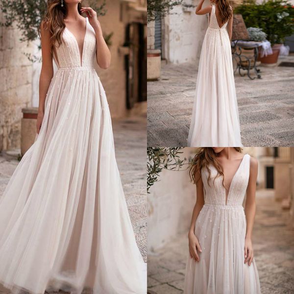 Discount Sexy Illusion Plunging V Neck Boho Inspired A Line Wedding Dresses 2019 See Through Casual Beaded Tulle Chic Bridal Gowns Wedding Dresses