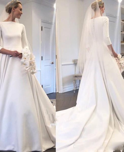 Discount Vestidos De Novia White Wedding Dresses 2019 Modest A Line Boat Neck Half Long Sleeve Sweep Train Satin Robe De Mariee Bohemian Bridal Gowns