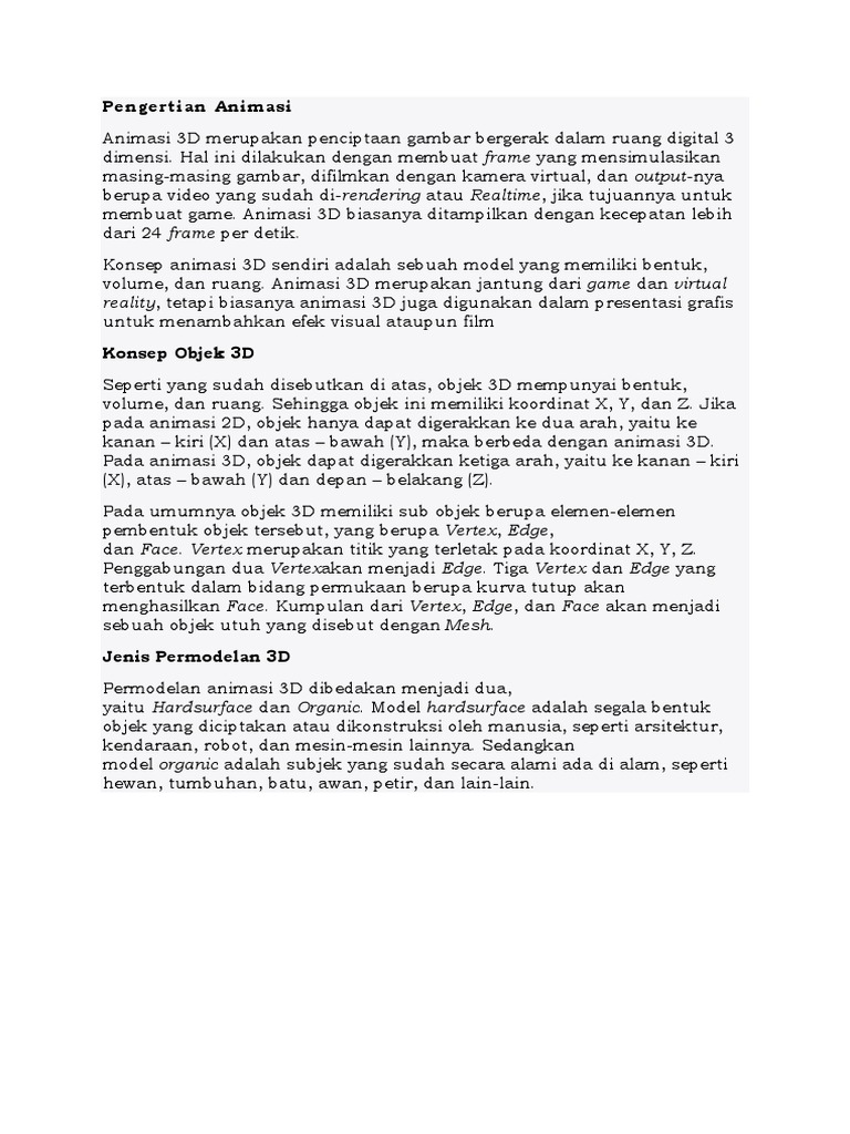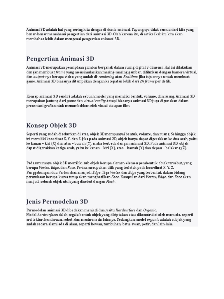 Pada pembuatan sebuah film berbasis animasi 3d biasanya menggunakan sebuah komputer yang di bagi menjadi tiga tahapan dasar yaitu. Semenjak toy story buatan disney pixar studio maka berlomba lombalah studio film dunia memproduksi film sejenis. Di artikel ini kita akan membahas lebih dalam tentang pengertian animasi 3d.